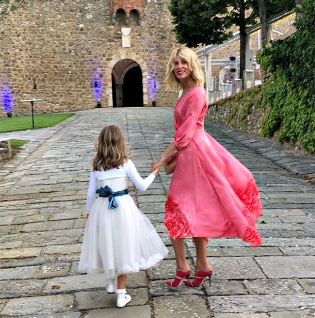 Alessia in questo caso ha indossato un bellissimo abito rosa dalla linea scivolata, incrociato sul seno per enfatizzare questo suo punto di forza e con le maniche lunghe ma morbide, reso più particolare dalle rose ricamate tono su tono sull’orlo della gonna e lo ha abbinato a decolletè a punta nello stesso colore, con listini bianchi a contrasto.