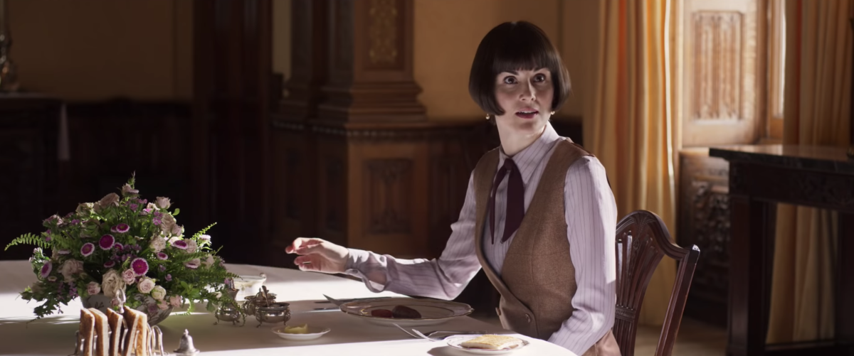 Nel film sembra che la protagonista del film Lady Mary abbia il compito di traghettare gli spettatori tra le due epoche perché la vediamo appunto elegantissima e molto femminile nel suo abito da sera, ma in un’altra scena diventa icona della donna moderna, anche un po’ androgina, con un outfit composto da gilet in tweed e cravatta.