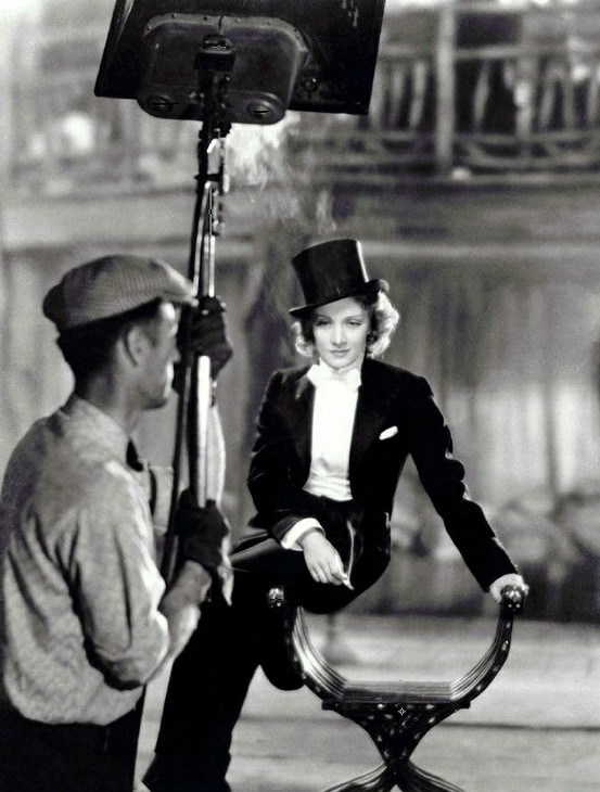 1930 – Una splendida Marlene Dietrich è protagonista di Marocco. L’angelo azzurro incarna in realtà una sensualità sfrontata e ironica. La sua femminilità sembrava moralmente e fisicamente ambigua, tanto che spesso i suoi personaggi si vestivano, e si comportavano, da uomo. Interprete perfetta del mannish style poi ripreso da altri registi/attrici.