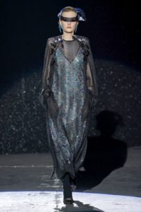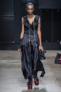 Altro trend forte di questo inverno è il nuovo Gotico: grande classico dei mesi invernali, per la sua forte inclinazione alle atmosfere cupe e ai colori più scuri, il nuovo Gotico trova un alleato formidabile per la stagione invernale 2019/20 ovvero il silver, unica sfumatura concessa in uno stile decisamente senza mezze misure. Per il resto il total black, i dettagli in catena e pelliccia e le stampe a tema horror (vedi la maglia Prada) la fanno da padrone.